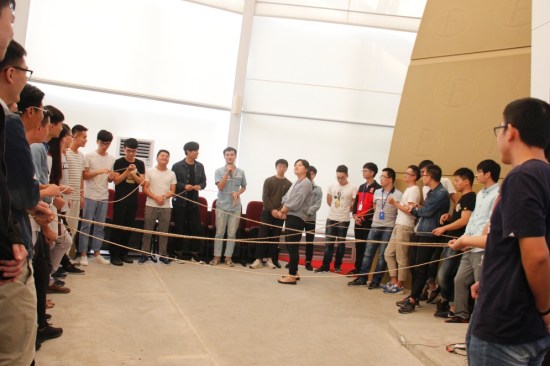 畢業生們拉繩圍圈,依次分享工作學習收獲并提出建議