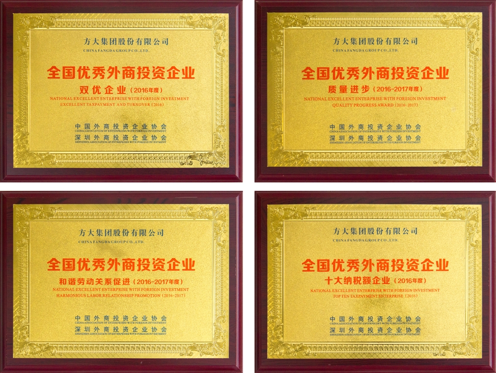 12月28日,深圳外商投資企業(yè)協(xié)會(huì)在深圳音樂廳隆重舉行2017年全國(guó)優(yōu)秀外資企業(yè)表彰大會(huì),表彰為推進(jìn)中國(guó)經(jīng)濟(jì)發(fā)展和社會(huì)進(jìn)步做出突出貢獻(xiàn)的優(yōu)秀外商投資企業(yè),鼓勵(lì)和促進(jìn)更多的外商投資企業(yè)爭(zhēng)創(chuàng)佳績(jī)。會(huì)上,方大集團(tuán)股份有限公司榮獲“全國(guó)優(yōu)秀外商投資企業(yè)——雙優(yōu)企業(yè)”、“全國(guó)優(yōu)秀外商投資企業(yè)——質(zhì)量進(jìn)步”、“全國(guó)優(yōu)秀外商投資企業(yè)——和諧勞動(dòng)關(guān)系促進(jìn)”、“全國(guó)優(yōu)秀外商投資企業(yè)——十大納稅額企業(yè)”四項(xiàng)大獎(jiǎng)。