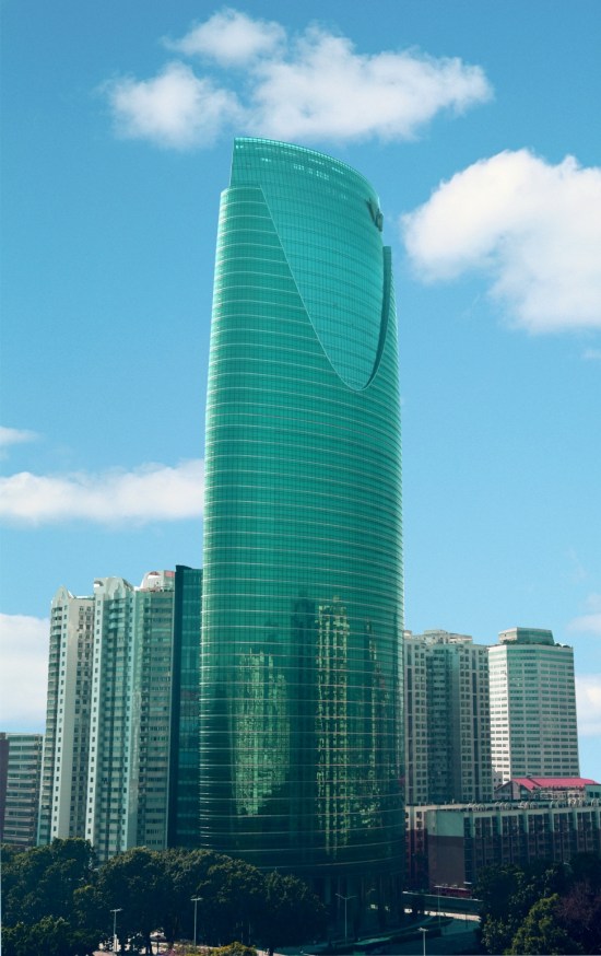 大廈外立面主要采用銀色鋁合金框+綠色和灰色中空LOW-E玻璃幕墻系統,樓層間采用不銹鋼裝飾板,玻璃幕墻外側設置橫向的不銹鋼遮陽板,通過外墻微妙的反光和綠樹、藍天、白云等自然景觀和周邊建筑物隨著時間在建筑物上的倒影變化,同時遮陽板也將隨著陽光照射的角度在樓身生成不斷變化的影子紋理,使整個建筑變得很豐富,又能與周邊建筑和環境相協調。