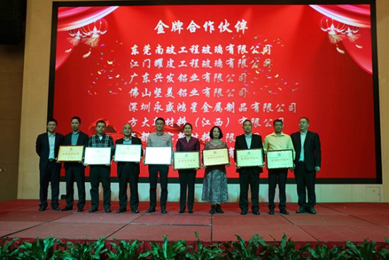 合作伙伴大會期間對在過去一年在與方大建科合作中有突出貢獻的合作伙伴頒發榮譽獎項,會上,方大建科合作進步獎、最佳服務獎、卓越品質獎、優秀供應商、金牌合作伙伴供應商五項大獎,東莞南玻工程玻璃有限公司等33家企業受到榮譽表彰。