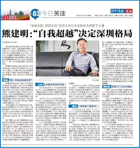7月29日,深圳商報刊發(fā)熊建明董事長專訪《熊建明:“自我超越”決定深圳格局》
